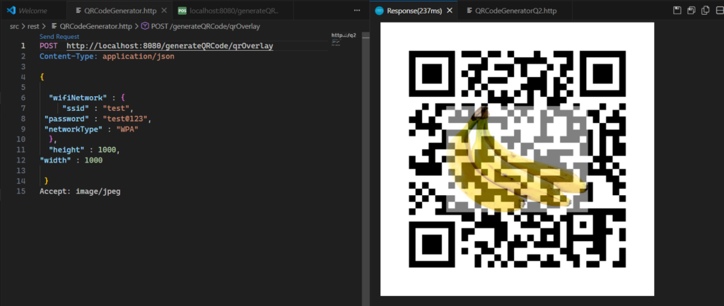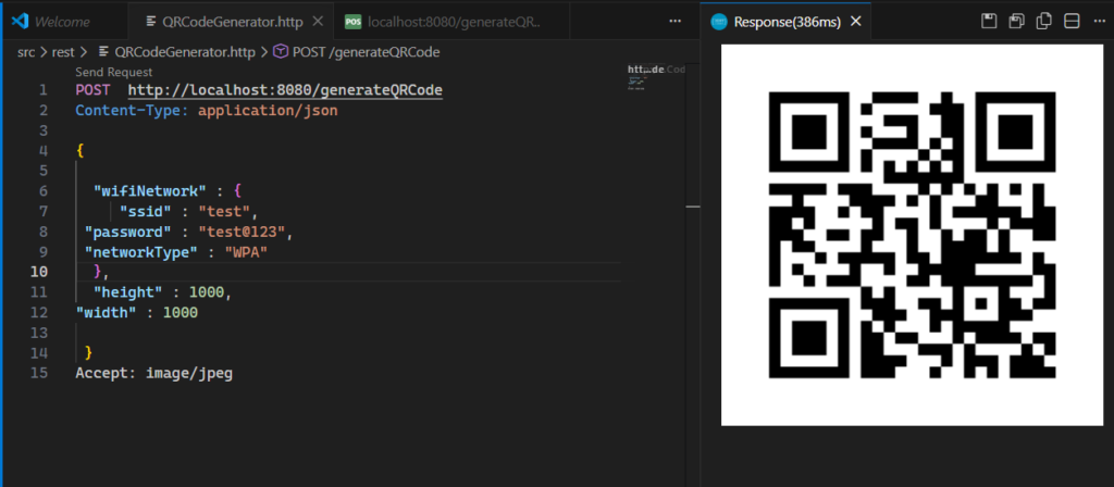 In our API, we will accept ssid, networkType and Password details and generate the QR code.